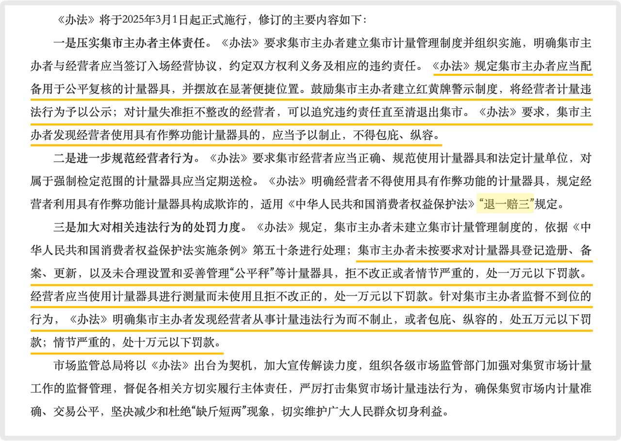 ○ 2025年3月1日:新版《集貿(mào)市場(chǎng)計(jì)量監(jiān)督管理辦法》施行。其中核心變化之一是全面壓實(shí)了市場(chǎng)主辦方的管理主體責(zé)任。要求其建立計(jì)量管理制度、對(duì)場(chǎng)內(nèi)秤具登記備案,并有責(zé)任制止并不得包庇計(jì)量作弊行為,否則將面臨高額罰款。這些規(guī)定從市場(chǎng)管理源頭建立了防線(xiàn),促使市場(chǎng)主動(dòng)加強(qiáng)對(duì)合規(guī)電子計(jì)價(jià)秤的監(jiān)督與采用。