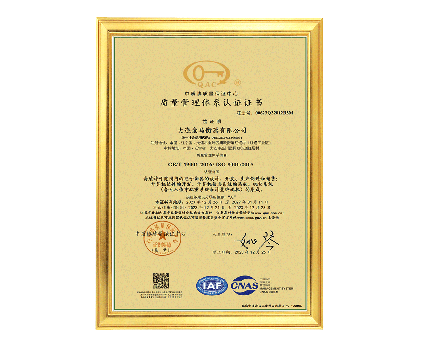 質(zhì)量管理體系認證證書